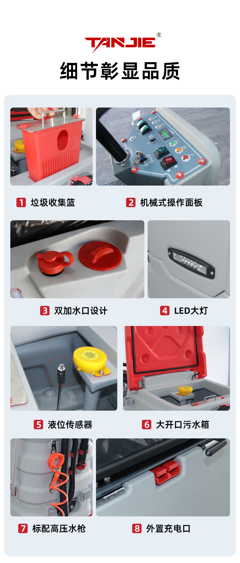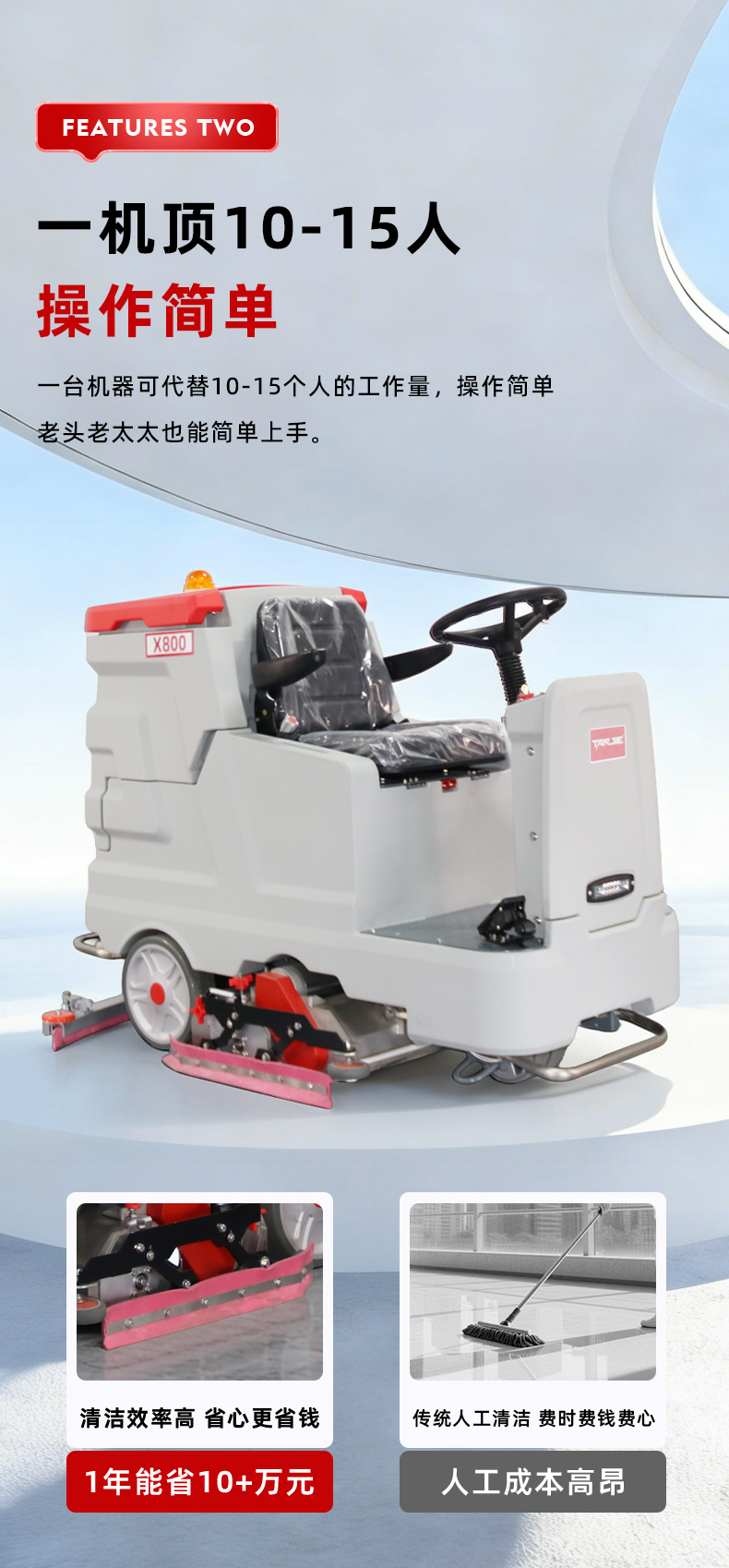 洗扫一体机X800产品介绍一、产品概述产品简介:洗扫一体机X800整机设计美观大气,操作简单易上手,一台机器可代替10-15人,适用于物业、医院、工厂、仓库、机场、车库等大面积室内场景地面清洁作业。产品定位:适用于大型工厂、物流仓库、商场超市等大面积硬质地面清洁场景,满足企业对高效、深度清洁的需求。设计理念:秉持人性化设计理念,注重操作便捷性与安全性,